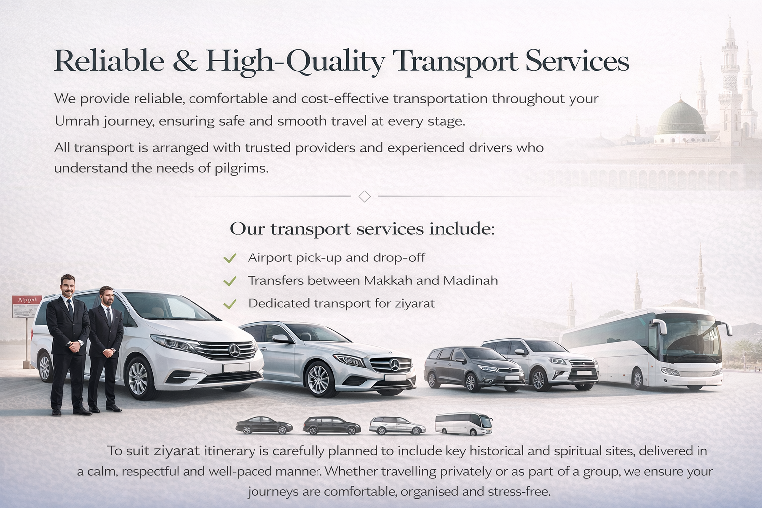 We provide reliable, comfortable and cost-effective transportation throughout your Umrah journey, ensuring safe and smooth travel at every stage. All transport is arranged with trusted providers and experienced drivers who understand the needs of pilgrims.